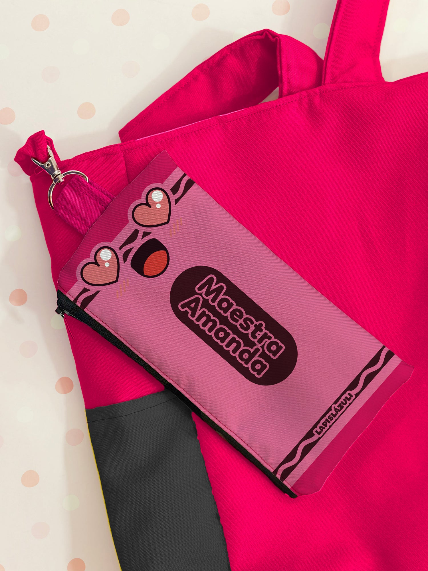 Al diseñar, podemos escribir tu nombre completo, solo tu primer nombre, o incluir títulos como Maestra, Miss, Educadora o Licenciada. También puedes elegir una frase corta que te identifique, o incluso pedir que vaya solo el diseño, sin texto.