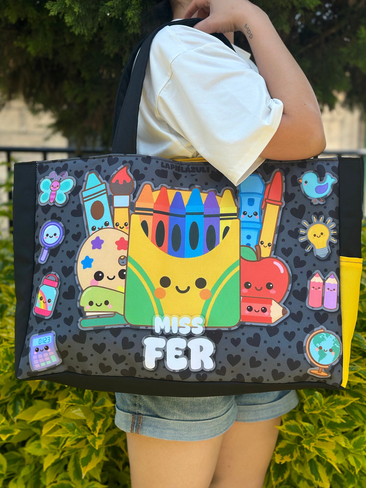 Al diseñar, podemos escribir tu nombre completo, solo tu primer nombre, o incluir títulos como Maestra, Miss, Educadora o Licenciada. También puedes elegir una frase corta que te identifique, o incluso pedir que vaya solo el diseño, sin texto.